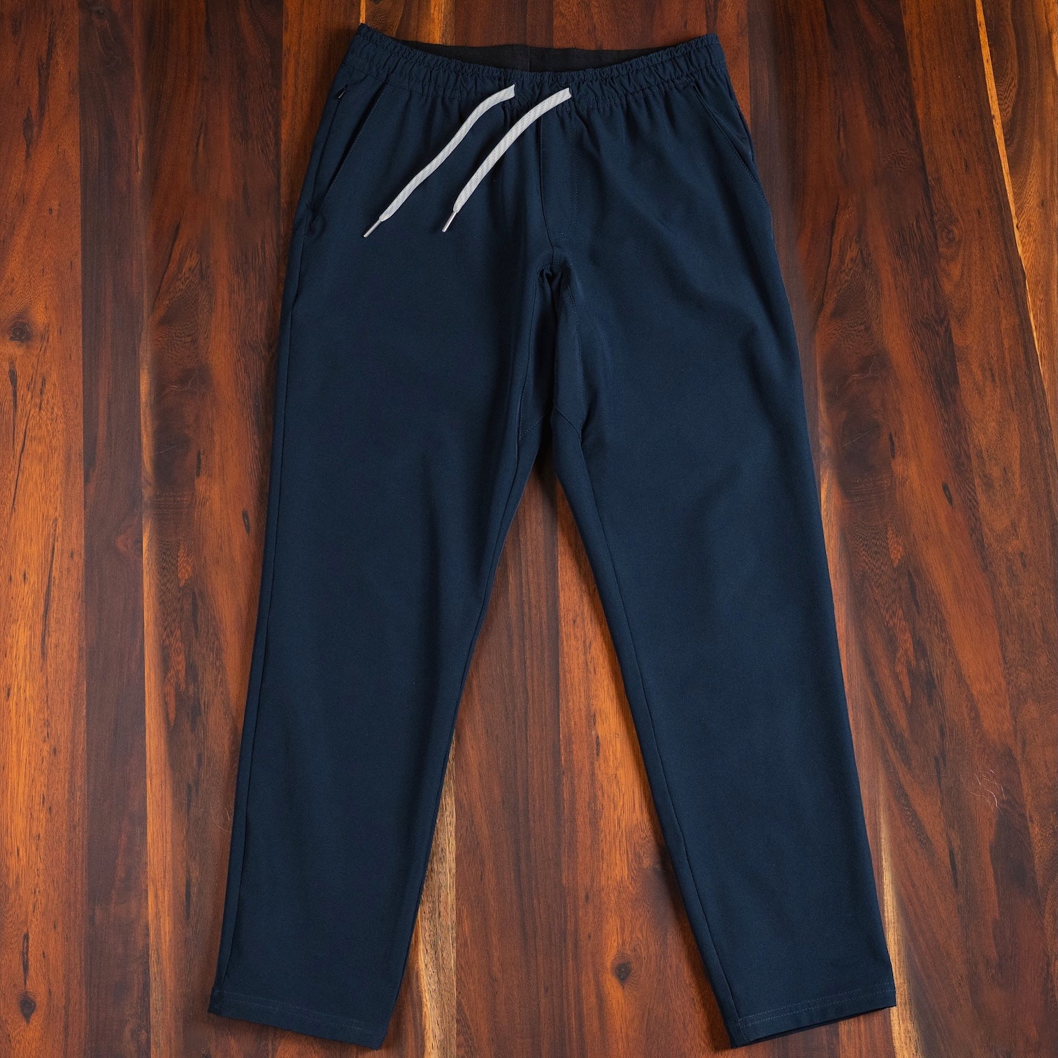 Fitted thigh that tapers narrower to traditional pant leg opening. Elastic waistband with drawstring and metal tips. Comfy, but makes them legs look good.