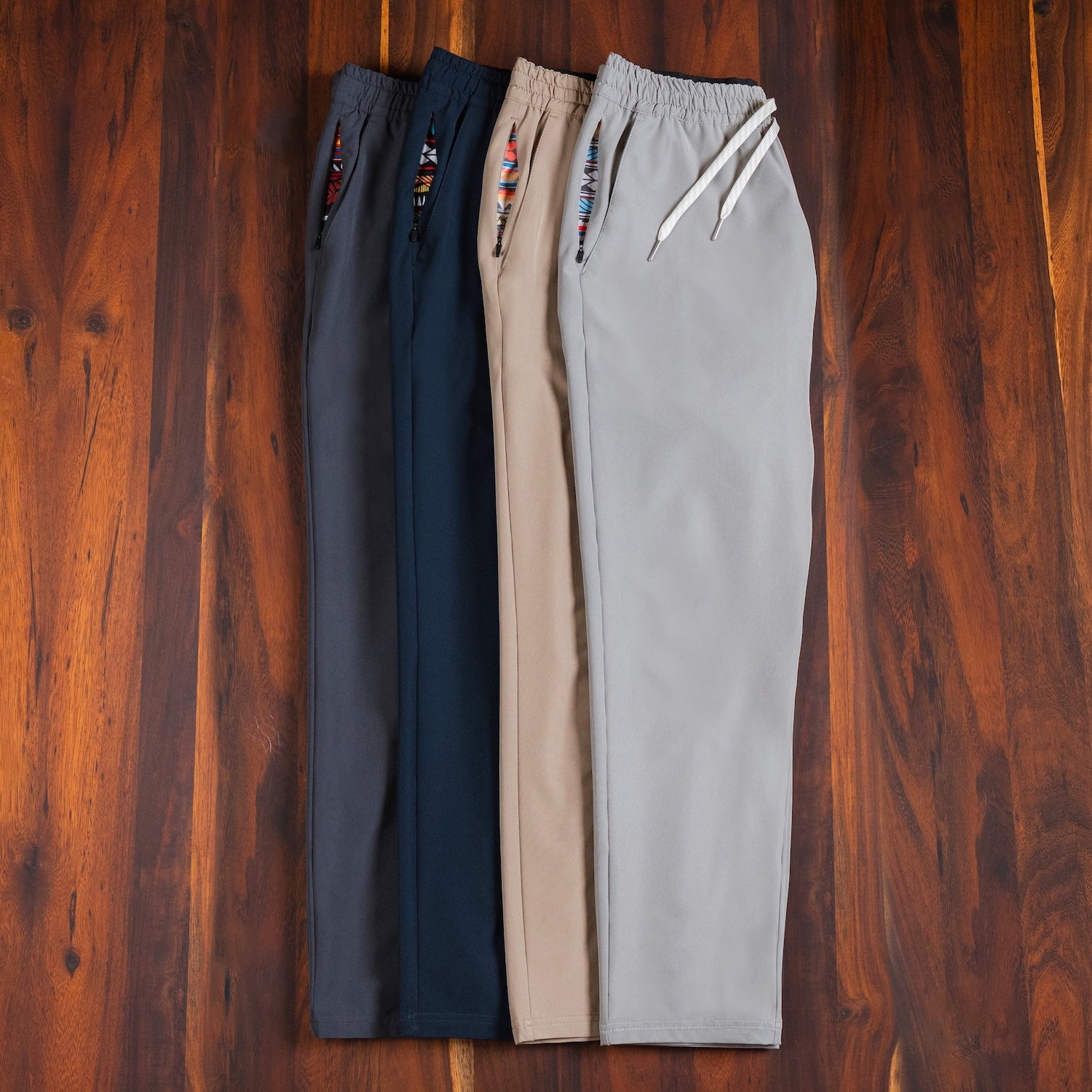 Fitted thigh that tapers narrower to traditional pant leg opening. Elastic waistband with drawstring and metal tips. Comfy, but makes them legs look good.